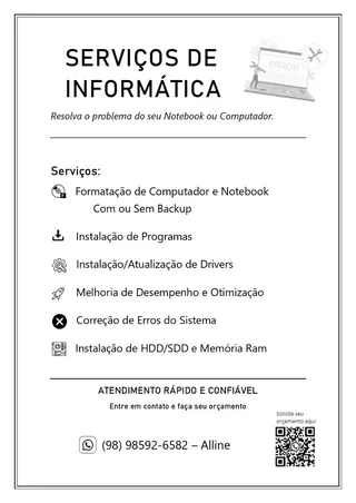 Formatação de Computadores e Notebooks Instalação/atualização de Drivers Melhoria de Desempenho e Otimização Correção de Erros Instalação HD, SSD, Memória Ram