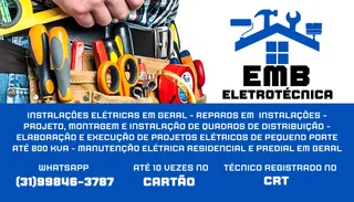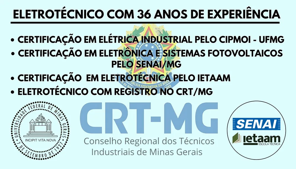Eletricista com 37 anos de experiência no ramo, com certificação pelo CIPMOI UFMG, SENAI E IETAM, com registro no Conselho Regional dos Técnicos de Minas Gerais.