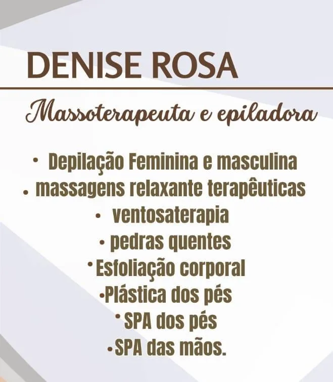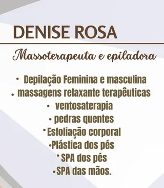 Olá meu nome é Denise Rosa faço trabalhos de Depilação unissex com cera quente, máquina, lâmina aparo pelos faço Massagens terapêuticas relaxante ventosa Pedras quentes Reflexologia podal SPA dos pés e mãos Escalda pés Esfoliação Corporal e Facial, atendo em domicílio